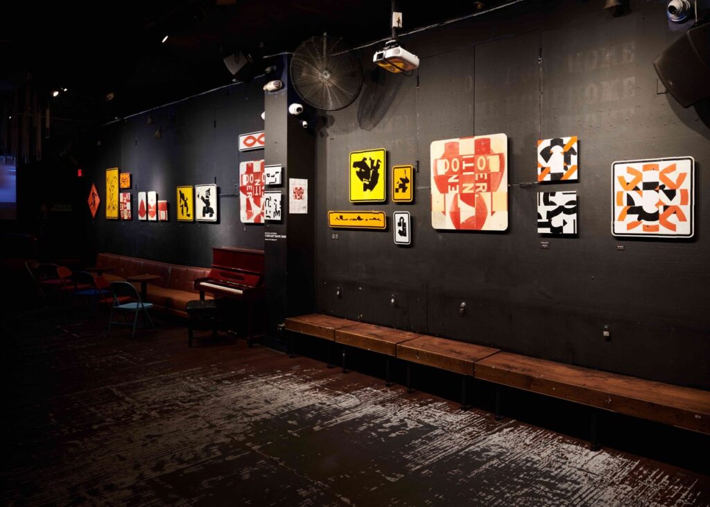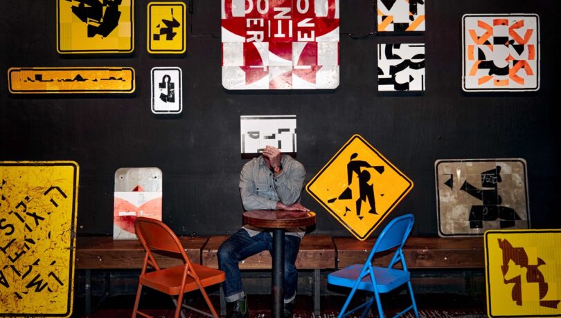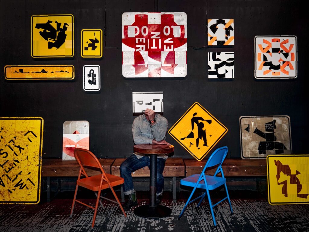 A large collection of his “Compliant Traffic Sign” pieces will be displayed on our 44’ long interior art wall.