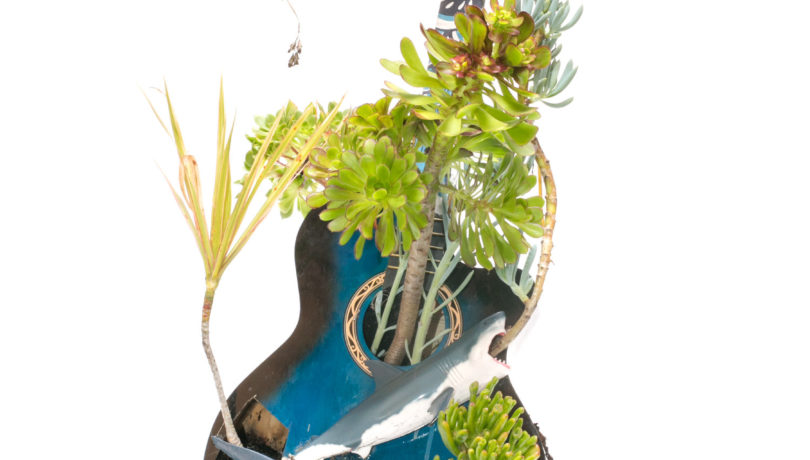 At face value, these are sculptures with a base layer of a broken musical instrument. The instruments contain installations that include living plants. As you water them to keep the plants alive, the instruments eventually change, and will potentially decay. Same goes for giving them sun. If you don’t take care of the individual plants, they will die. But if you do take care of them, the instrument will probably be destroyed.