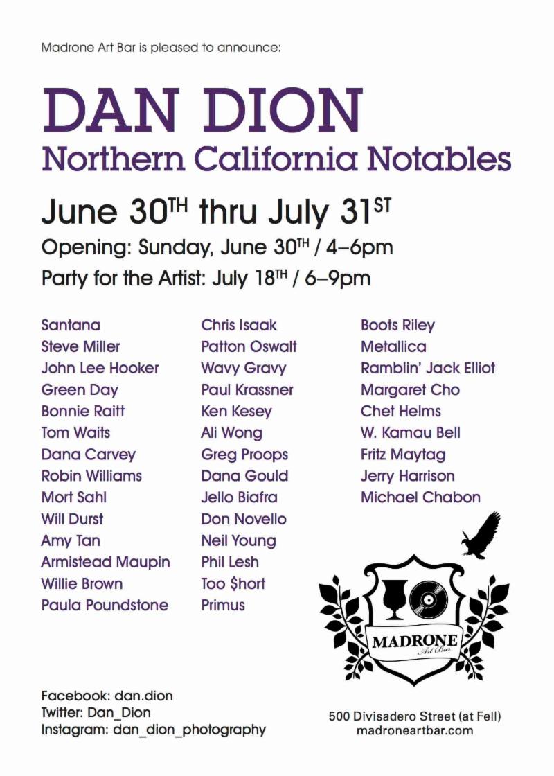Dan Dion is a photographer specializing in the performing arts. He was the house photographer for the Fillmore and Warfield for twenty years, and continues as the house photographer for the Paramount Theater, Punch Line Comedy Club, and Cobb’s Comedy Club.