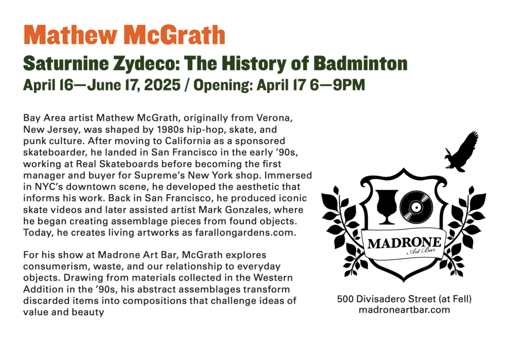 Bay Area-based artist Mathew McGrath, originally from Verona, New Jersey, initially gravitated towards the 1980s hip-hop, skateboarding, and punk scenes. As a sponsored skateboarder, he embarked on a journey to California, seeking his fortune. In the early 1990s, he found his way to San Francisco and secured a job at Real Skateboards. This opportunity led him to become the first manager and buyer for the newly established Supreme skate shop in New York City. During his time in NYC in the 90s, Mathew immersed himself in the downtown skate scene and credits this experience as formative in shaping his aesthetic and future artistic practice. Returning to San Francisco, he ventured into the world of skateboarding, shooting, directing, and producing some of the iconic skate videos of the 1990s. Subsequently, he became the studio assistant to fellow skateboarder and artist Mark Gonzales in San Francisco’s Tenderloin. “Mark provided me with a space to work in the basement of his studio. For years, I had been collecting ‘garbage’ and discovering objects during my daily travels. It was in this studio environment that he began creating his found object assemblage and collage pieces. Currently, Mr. McGrath designs and installs living works of art under the moniker farallongardens.com.